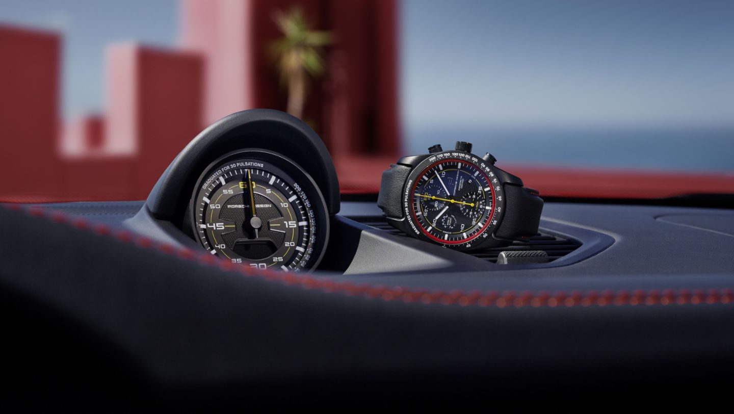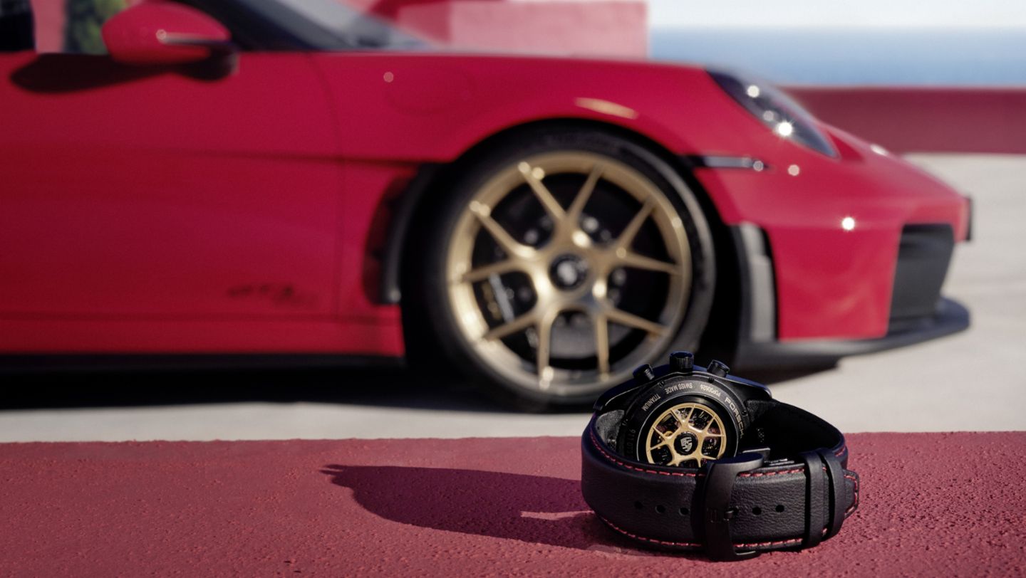 Exclusively for owners of the 911 GT3 S/C, Porsche Design presents an extraordinary timepiece that transfers the design and performance of the sports car to the wrist. The chronograph 911 GT3 S/C is equipped with the precise, COSC-certified Porsche Design caliber WERK 01.200, which has a flyback function. The ultra-light titanium case, optionally with black titanium carbide coating, combines sports car design with modern watchmaking. The GT3 themed dial with yellow accents and hexagon structure reflects the vehicle's instrument panel, while the winding rotor is modeled after the designs of the respective magnesium forged wheel. The color ring of the dial is available in all exterior colors of the 911 GT3 S/C, including the coatings of the \"color of your choice\" range. The strap, made from original Porsche interior leather and stitching, is also tailored to the respective configuration of the vehicle.