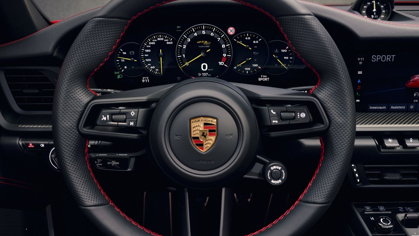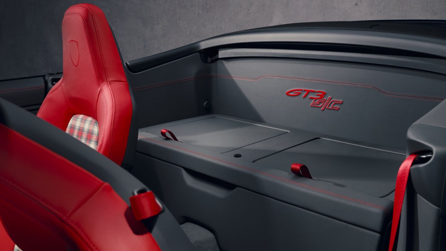 Weight-saving materials appear in many parts of the interior, as well. Lightweight carpets and lightweight door panels taken from the 911 S/T with CFRP handles are used here. The 911 GT3 S/C is a pure two-seater. Four-way Sport Seats Plus are fitted as standard. As an option, folding lightweight bucket seats with seat shells made of CFRP are available. The seats are equipped with an integrated thorax airbag, electric height adjustment and manual longitudinal adjustment. Standard three-stage seat heating is included with the folding bucket seat as it is with the standard Sport Seats Plus. The interior is lined with black leather as standard – including the sun visors and the A-pillar trim. The GT3 S/C logo is embroidered in the middle of the rear trim panel. The seat center inserts are upholstered in perforated leather. As with the 911 S/T, the steering wheel is also upholstered in perforated leather. Just like the other 911 GT3 variants, the 911 GT3 S/C has an ignition switch rather than a start button to the left of the steering wheel. The digital instrument cluster in the middle supports the driver with a clearly structured display and operating concept. The "Track Screen" display mode reduces the digital displays on the left and right of the tachometer to important readouts including tire information, oil, water and fuel, and indicates the optimum shift point with a flashing light. If desired, the tachometer can rotate to position the 9,000 rpm redline at the 12 o'clock mark.