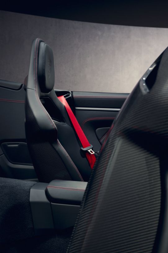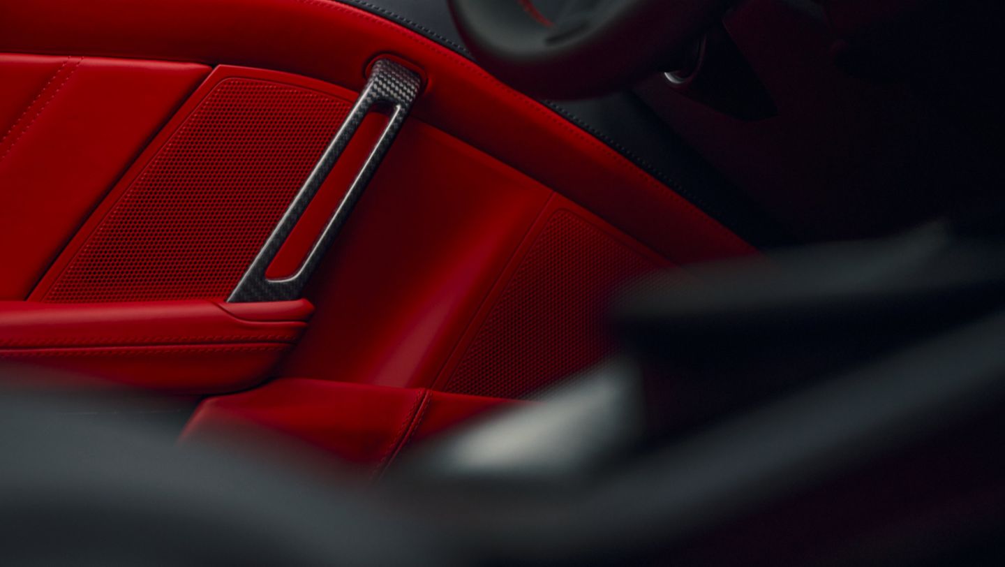 In the front luggage compartment, a reversible mat combines function and style with high-quality carpet in Slate Grey on one side and leather in Guards Red on the other. The sun visors, the upper interior mirror panel and the interior windshield frame are upholstered in perforated Race-Tex in Slate Grey. The material also ensures a sporty and elegant look on the convertible top molding.