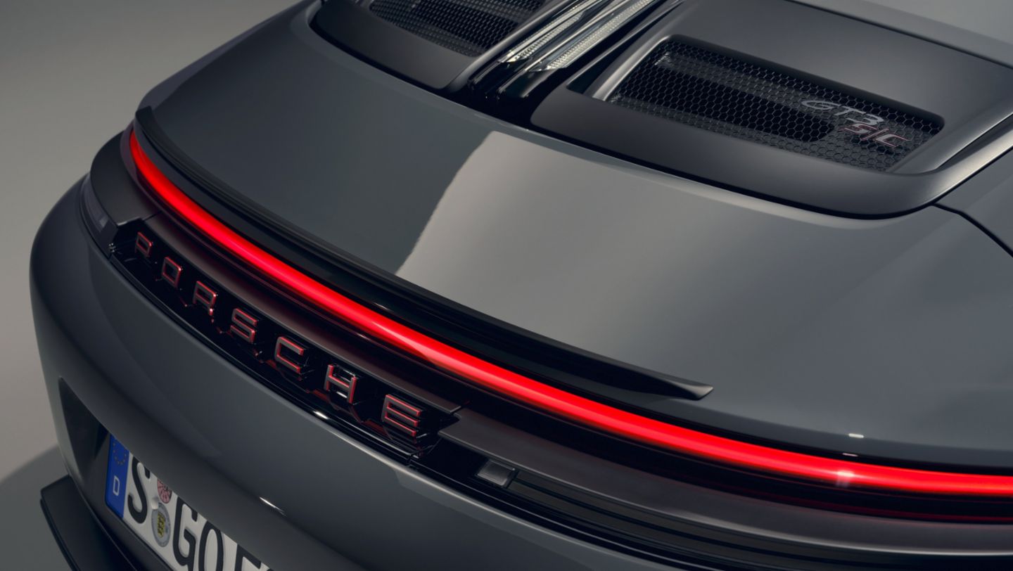 Matching the black top, the windshield frame is foiled in black and makes the 911 GT3 S/C unmistakable, but it can also be ordered in body color as an option. The stone chip protection film on the side panel is also matte black. The Matrix Design LED headlights include daytime running lights, eliminating the need for additional lights in the front fascia. This allows for a particularly large air intake area and a clearly structured appearance. For the first time in a 911 with convertible roof, the retractable rear spoiler has a Gurney flap at the rear, as in the 911 S/T and the 911 GT3 with Touring Package. The front spoiler lip and rear diffuser are shared with the current 911 GT3.