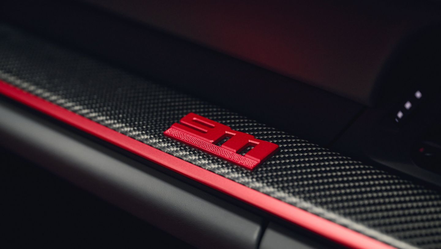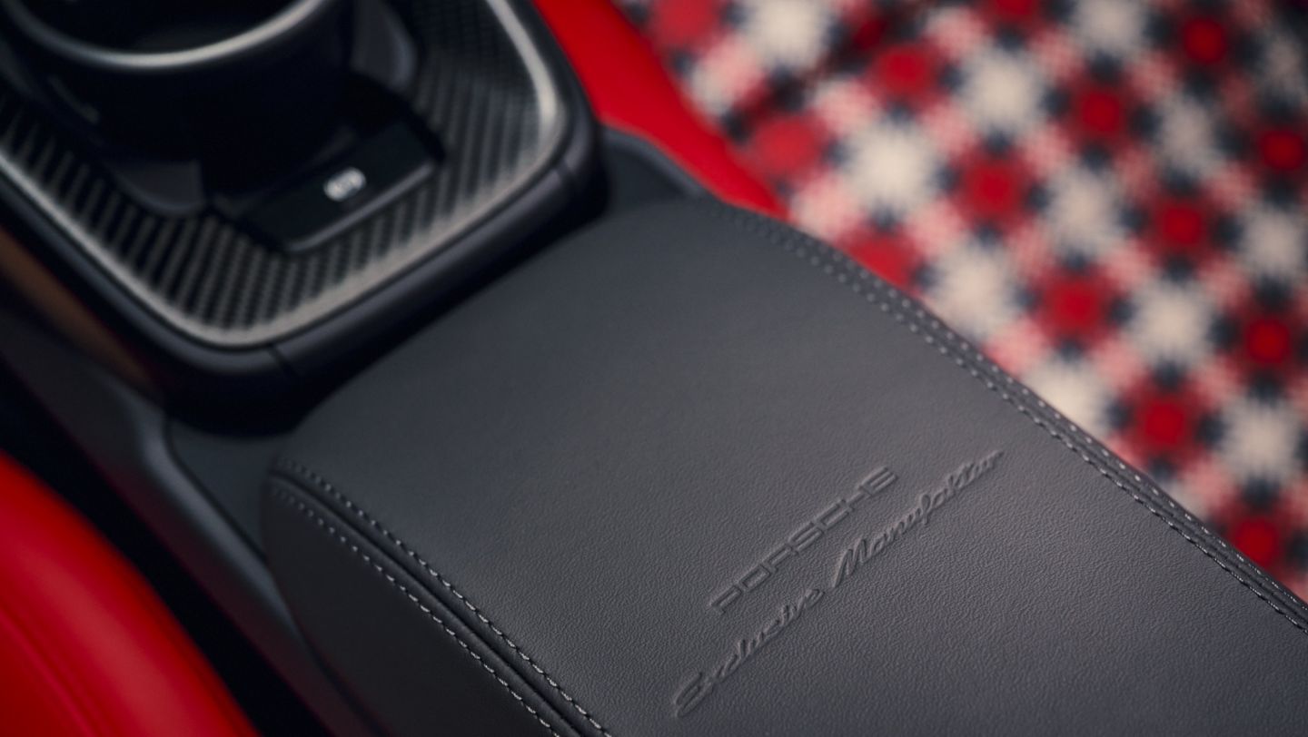 In the interior, the optional Adaptive Sport Seats Plus with the embroidered coat of arms outline on the headrests immediately catch the eye. In particular, the seat centers underline the precision and craftsmanship that go into the package. The elaborately produced, four-color braided leather in Slate Grey, Guards Red, Magnesium Grey and Kalahari visually is a visual standout both on the seats and in the glovebox. In addition, the interior is almost completely lined with two-tone leather in Slate Grey and Guards Red. The contrasting stitching, door opener loops, seat loops and straps in Guards Red also add to the package. The steering column trim, the seat console, the inner door sill trim and the fuse box cover are made of leather, which is also used to trim the air vents including the slats. In addition, the floor mats have leather piping around their edges.